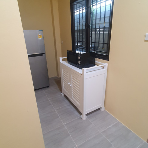 Nikki's Apartments at Agape Home are on the verge of opening, with the completion of the installation and setup of furniture in all 10 rooms. Each room boasts modern amenities such as air conditioning, ceiling fans, a microwave, and a refrigerator. Additionally, the uncovered area at the back of each unit features a water tap, a drying rack, some food storage, and a gas stove.