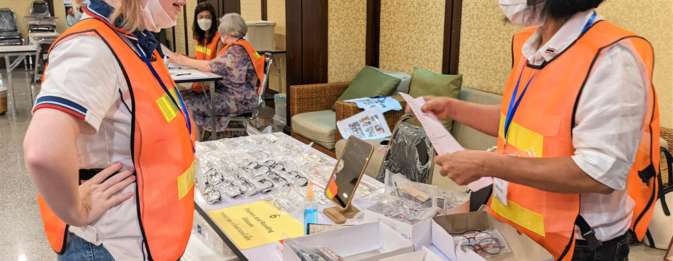We plan to start our screenings in August, so we do not have pictures at the schools yet. Unfortunately, our optician, Khun One, could not attend with his equipment, since his wife had COVID. Here are a few photos of our volunteers during the simulation.